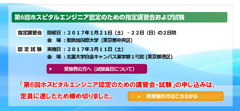 - 「第6回ホスピタルエンジニア認定のための講習会・試験」の申し込みは、 定員に達したため締め切りました。