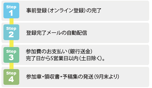 登録手続きを完了し、参加費をお支払いいただいた方へは、参加章・予稿集をお送りいたします。9月末からの発送を予定しております。