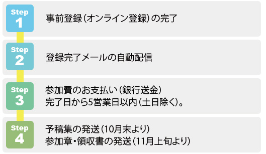 登録手続きを完了し、参加費をお支払いいただいた方へは、参加章・予稿集をお送りいたします。10月末からの発送を予定しております。