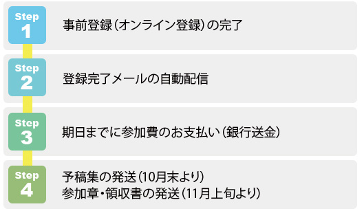 登録手続きを完了し、参加費をお支払いいただいた方へは、参加章・予稿集をお送りいたします。